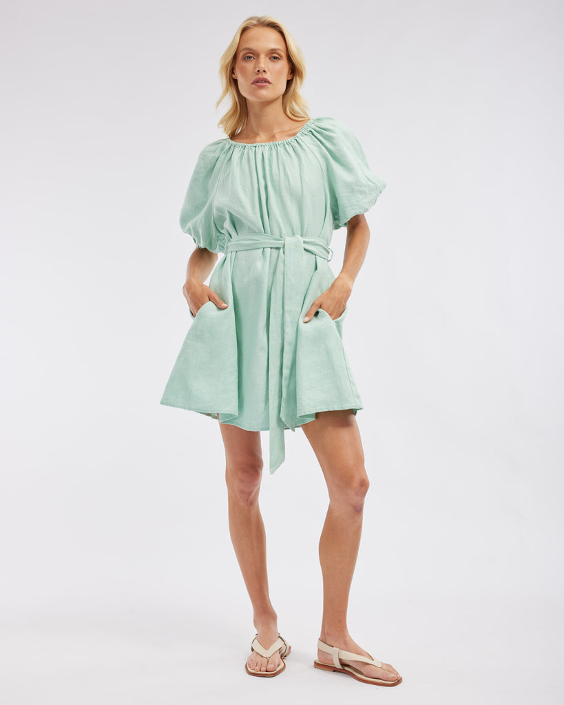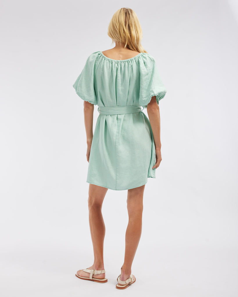 Playing sister to our beloved Wren Linen Maxi Dress, the Wren Linen Mini Dress is an embodiment of effortless style. Crafted from our high-quality linen, it is perfect for warmer days as it is breathable and durable. The dress boasts an elasticated neckline, romantic puffed short sleeves, dual side pockets, while the removable ties cinches in the waist for a flattering silhouette. The dress can be worn on or off the shoulder, with or without the belt, making it a versatile addition to any wardrobe.